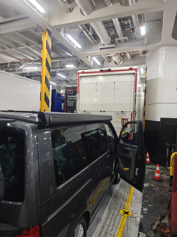 A short drive to the ferry and remarkably, a very smooth crossing. No dramas, no feeling ill. We were very lucky whilst boarding the ferry in that all the caravans in front of us were marshalled up the ramp to a higher deck whilst we were routed to the front of the boat just behind the lorries.